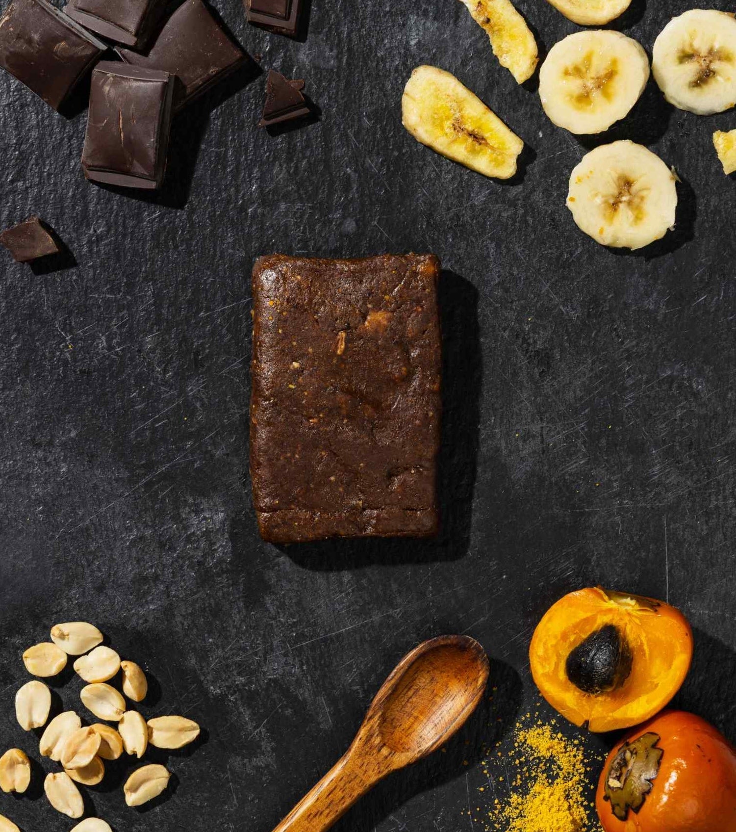 Ingredientes: Banano deshidratado, harina de pejibaye, mantequilla de maní sin sal, chips de piña, claras de huevo en polvo, chocolate sin azúcar, agua.