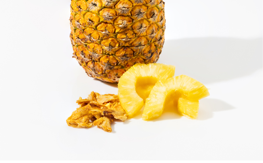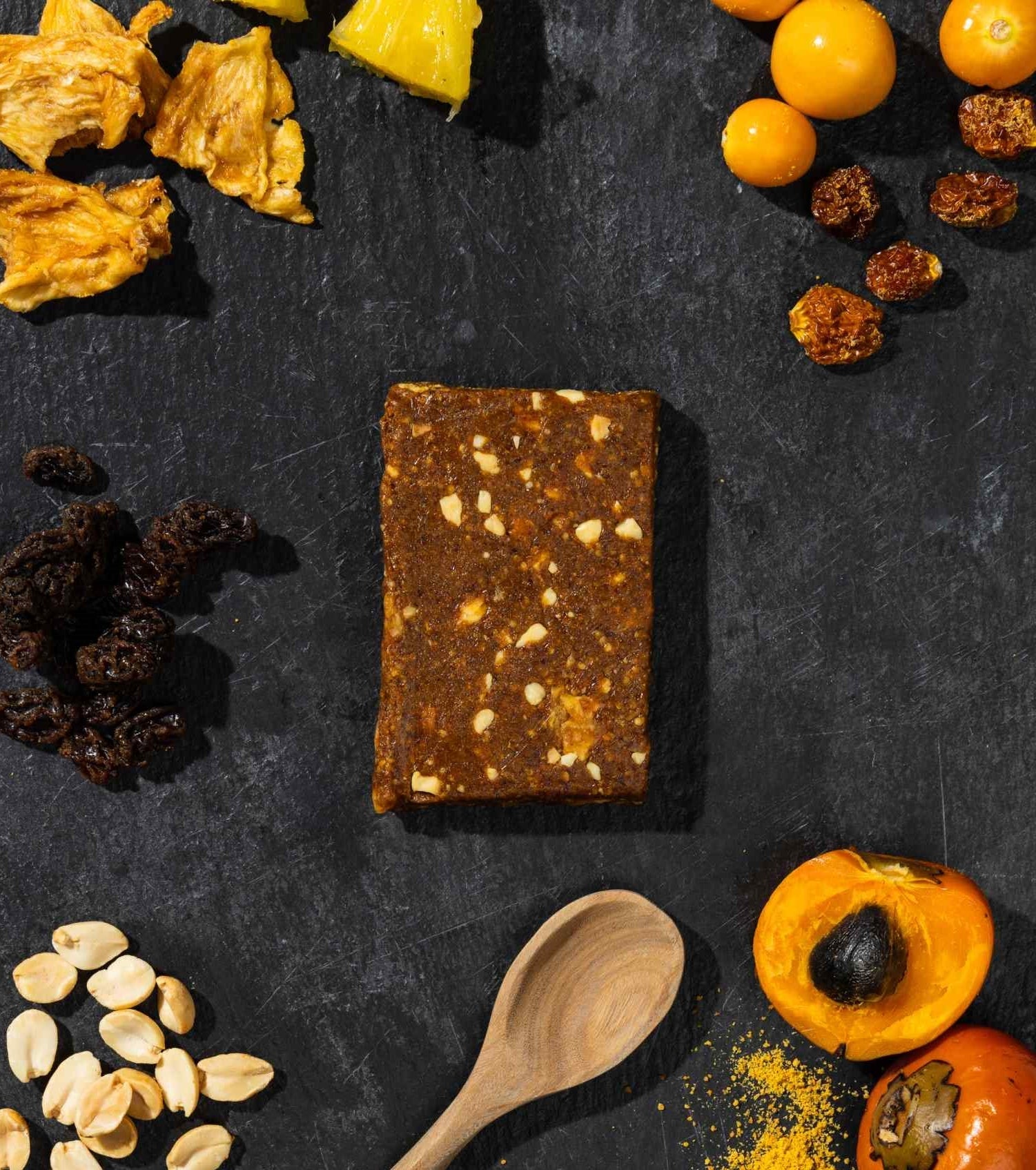 Ingredientes: Pasas, uchuvas deshidratadas, harina de pejibaye, mantequilla de maní sin sal, claras de huevo en polvo, trozos de piña, maníes y agua.