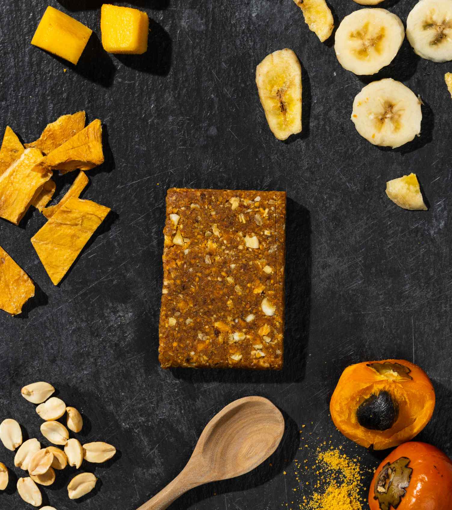 Ingredientes: Mango deshidratado, banano deshidratado, harina de pejibaye, chips de piña, mantequilla de maní sin sal, claras de huevo en polvo y agua.